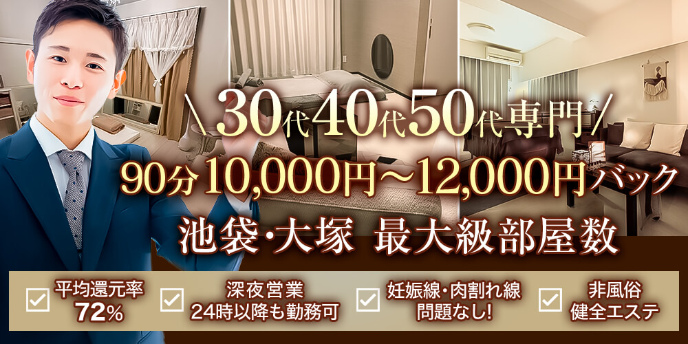 当店について | 〖店 名〗Madonna-マドンナ- 〖業 種〗メンズエステ(一般エステ) 〖職 種〗セラピスト 〖勤務地〗各線「池袋駅」「大塚駅」徒歩5分 〖勤務日〗完全自由出勤となります!短時間の勤務もOK! 〖勤務時間〗11:00~翌5:00の間でお好きなお時間で勤務可能♪ (午前中、深夜ともに沢山のお問合せがあります!!) ⭐Madonna-マドンナ-のココがポイント⭐ ✅30~50代専門のお店で、還元率はエリアトップクラス! (90分10,000円+αで、なんと最大82%還元♪) ⇒他のお店だと還元率はだいたい50~55%くらいが多いですが、当店は売上のほとんどが女性のお給料になるシステムなんです✨ ✅雑費0円 ⇒お店によっては「ルーム使用料」として1,500円~3,000円くらいお給料から引かれるところもあるのですが、当店はそんな心配なし!稼いだ分はぜ~んぶそのままお給料になります✨ ✅圧倒的、広告宣伝力!! ⇒当店は他のお店の約4倍もの広告費をかけて宣伝しているので、「お客さんが来ない…」なんて心配はナシ!集客力バツグンです🔥 🩷お給料イメージ🩷 👩🦰35歳/独身/会社員/156㎝/61㎏ 出勤:21:00~翌5:00(8時間勤務) 1日のお給料:67,000円 👩🦰42歳/既婚者(子供2人)/パート/160㎝/68㎏ 出勤:12:00~17:00(5時間勤務) 1日のお給料:30,500円 👩🦰53歳/既婚者/専業主婦/153㎝/65㎏ 出勤:10:00~17:00(9時間勤務) 1日のお給料:41,000円 当店のコンセプトは『大人がオトナに癒される』 ここ数年、30代~50代の女性を求める男性がどんどん増えてきています。 その理由は、人生経験から生まれる安心感や信頼感、そして優しく包み込む雰囲気──まさに大人の女性ならではの魅力です✨ 当店に来られるのは、精神的に余裕のある紳士なお客様ばかり。 「若い子のお店より安いから来る」という方は一切いません。 年齢ごとの魅力をきちんとお伝えし、それを理解してくださるお客様だけに接客していただける環境です♪ ✅採用条件:30歳~59歳まで 《平均年齢41.5歳》 ✅経験の有無:経験者・未経験者ともに大歓迎です! ✅跡・傷に関して:完全着衣での接客となるため肉割れ線、妊娠線、手術跡、その他 全く問題ありません!! ✅在籍女性の半数がぽっちゃり女子! (体型一切問題なし) ⭐よくある質問まとめ⭐ 🙋♀️「1日にどのくらい稼げますか♡」 ⇒1日8時間勤務でだいたい3~5万円が平均✨ さらにリピーターさんをつかめばつかむほど、お給料はどんどんUP⤴ 中には1日で6万~8万円稼ぐ女性もたくさんいますよ♪ 🙋♀️「給与は日払いですか♡振り込みですか♡」 ⇒完全日払いです✨ その日のうちにお給料をお持ち帰りOK٩(ˊᗜˋ*)و 🙋♀️「遅刻や病欠した際、何かペナルティはありますか♡」 ⇒罰金・ペナルティはございませんのでご安心ください😊 🙋♀️「週何日、1日何時間からの勤務が可能ですか♡」 ⇒週に1回、月に1回でもなんでもOK!ご自身のペースに合わせてご出勤いただけます♪ 🙋♀️「掛け持ちは可能ですか♡」 ⇒全く問題ありません✨ 🙋♀️「仕事が覚えられるか不安です。」 ⇒未経験から始める女性が在籍の7割です✨ だから、初めてのお仕事での不安や悩みもしっかり理解しています❗ 一人ひとりのペースに合わせて、「分からないことがないように」丁寧に教えていくのでご安心ください🫡 「エステだから身体・精神的な負担も0に。」 🔰施術の内容🔰 1⃣ドライマッサージ(もみほぐし) ▶手のひら、頭、肩、腰などを指圧するマッサージ 2⃣アロマトリートメントマッサージ ▶専用のオイルを使用し、全身のリンパの流れを促進 ✅サービスの主体はオイルマッサージとなります。 力の要らないオイルマッサージは未経験の方でも簡単に覚えることができます!! 👑接客の流れ👑 1⃣待機(各ルーム・個室待機) ▶お客様をお迎えする準備をしていただきます♪ ▶出勤時は出勤したことをTwitterもしくは日記に投稿 ▶完全自由時間をお過ごしいただけます♪ 2⃣受付スタッフからの連絡 ▶スタッフからお客様の入室時間を確認し、お客様をお迎え 3⃣コース確認・料金預かり ▶ご予約コースと料金を確認し、オプションのご案内 4⃣シャワーご案内 ▶お客様をバスルームへご案内します 5⃣施術 ▶ご予約いただいた時間にあわせて指圧やオイルトリートメントを行います 6⃣シャワーご案内 ▶時間になったらお客様をバスルームにご案内します 7⃣お見送り ▶玄関先までお客様をお見送りします 8⃣次の接客の準備 ▶シャワー、お着替え ▶ルーム、バスルームの後片付けなど ▶次の予約まで時間の余裕があれば好きなことに時間をお使いください♪(事前にお伝えいただければ休憩も大丈夫です!) ---------------------------- ✅お給料に関して… ▷その日の最後のお客様を接客した後、当日のお給料の精算です! ▷お預かり金から当日分報酬全額をお渡しします♪ --------------------------- 🙆🏻♀️《女性エステ講師募集中》 当店で働く女の子に技術指導やサポートをして頂きます✨ 入店した女の子が安心して働けるように新人講習からスキルアップ講習、また女の子のお仕